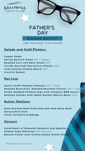 Treat the amazing dads in your life to a delicious evening at the Kelowna Yacht Club. Join us for our Father’s Day Dinner Buffet featuring chef-curated dishes, decadent desserts, and a stunning lakefront view. Let us do the cooking while you enjoy quality time together.